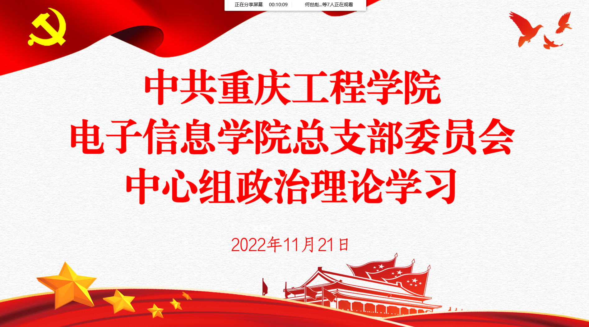11月21日,电子信息学院党总支组织全体中心组成员集中学习党的二十大报告,会议由党总支书记谭思宇主持,中心组全体成员参加。