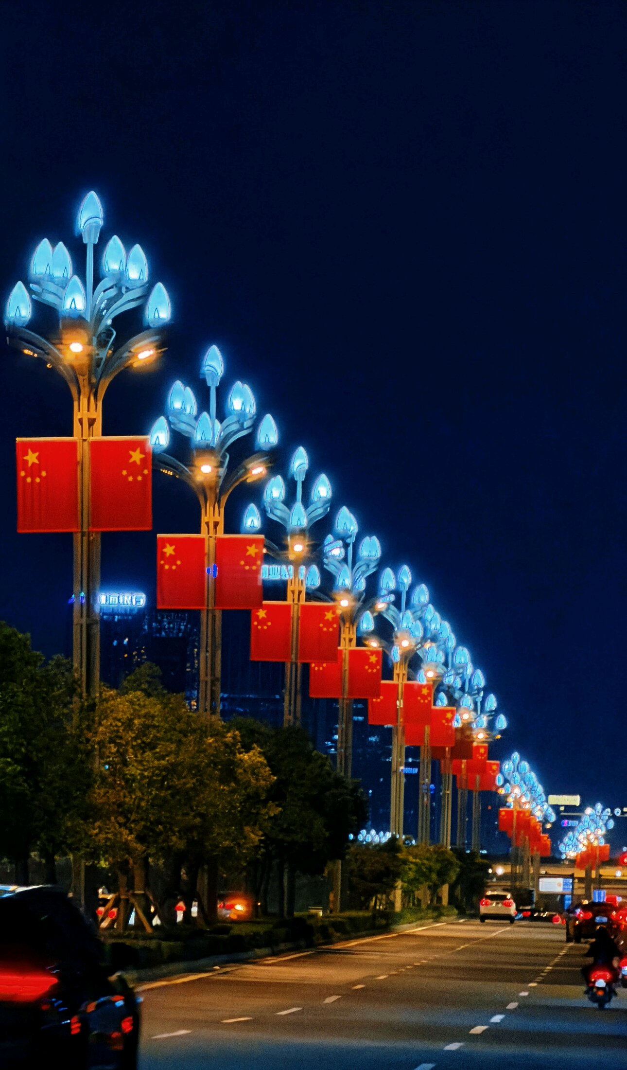 经评选,李颖的作品在六十多份作品中脱颖而出,荣获此次活动一等奖,一排造型独特的路灯亮起蓝白色灯光,道路上车流穿梭,远处高楼的灯光与路灯交相辉映,营造出浓厚的国庆氛围,彰显出城市在国庆时的繁华与喜庆,传递出对祖国的热爱与祝福。