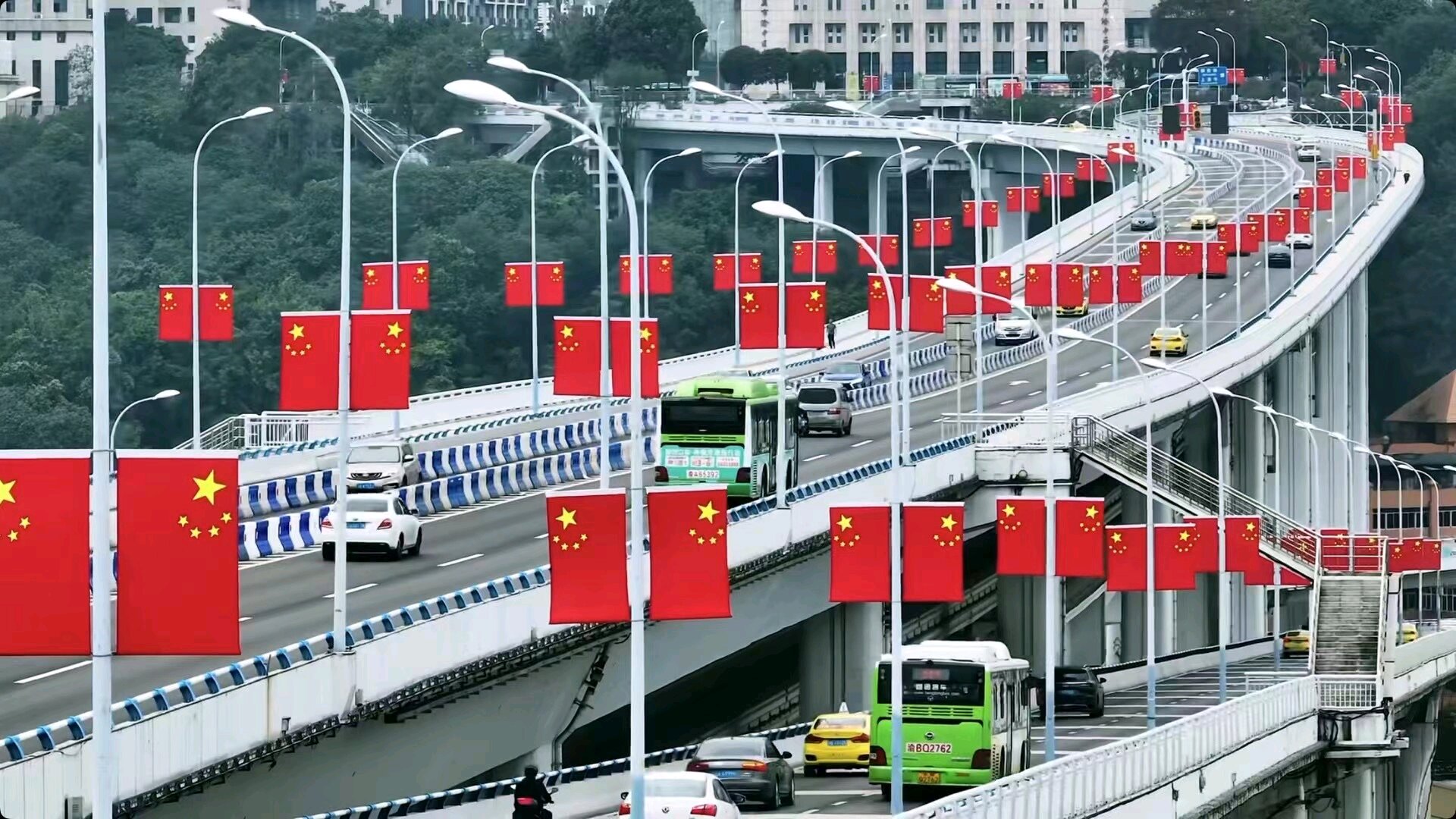 牟芳琳、王露霖和刘思琪的作品均被评为三等奖,密集的中国国旗整齐悬挂,桥下红旗川流不息,彰显对祖国的热爱与崇敬,同时展现出对国家的认同感和自豪感。
