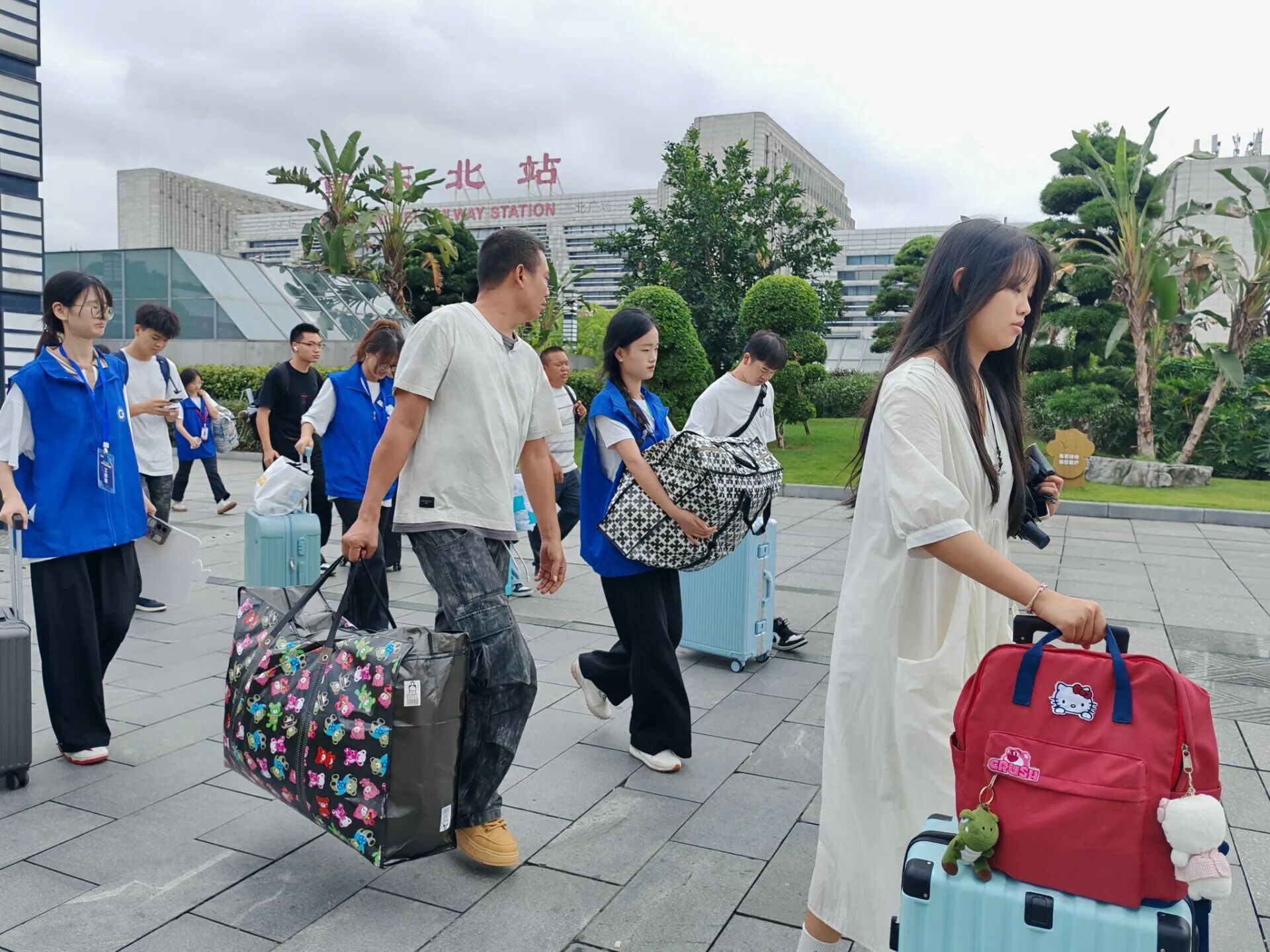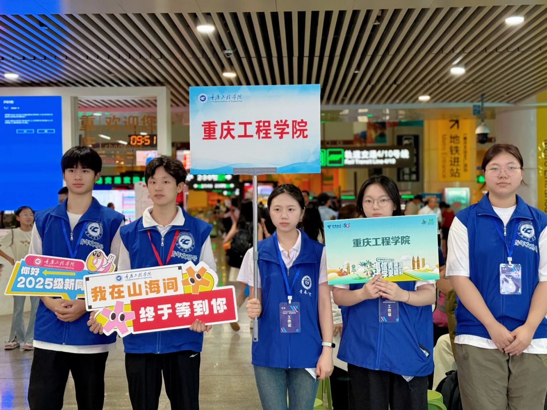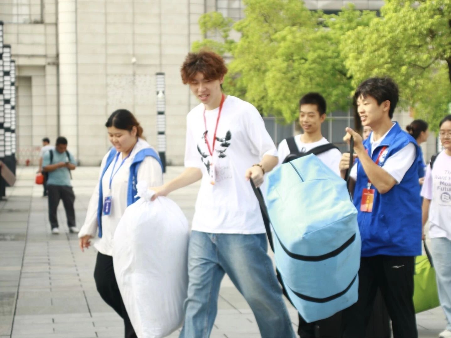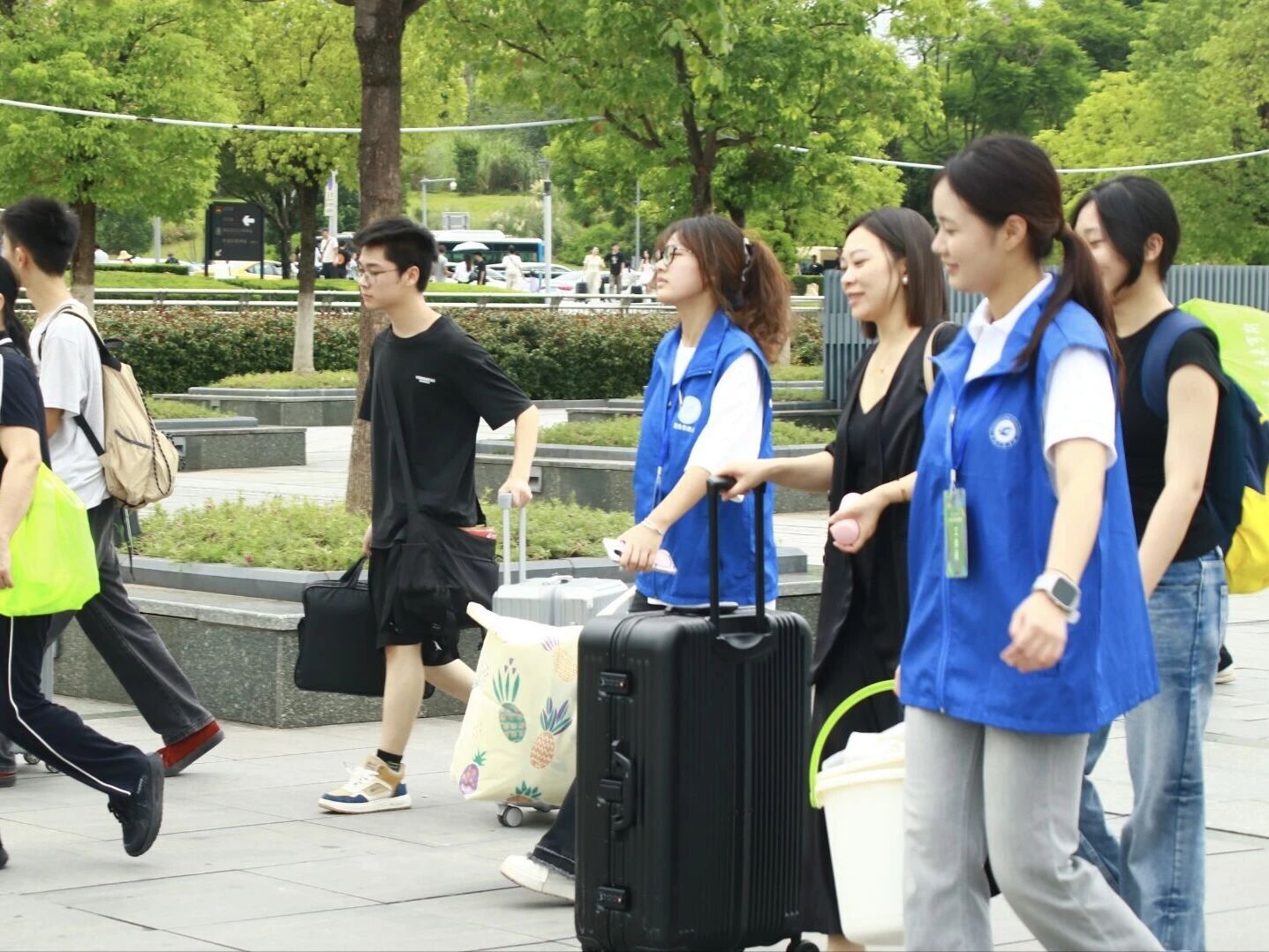 从清晨到日暮,志愿者们始终以饱满的热情主动靠前服务:在车站与校门口协助新生搬运沉重行李,耐心引导新生前往报到点,细致解答关于专业咨询、宿舍分配、校园设施等各类疑问,更全程协助新生有序搭乘校园接送大巴,用脚步丈量校园每一处迎新路线,用行动为新生搭建起 “安全、快速、顺畅” 的报到通道,成为校园里一道靓丽的 “蓝色风景线”。