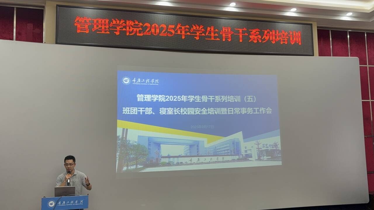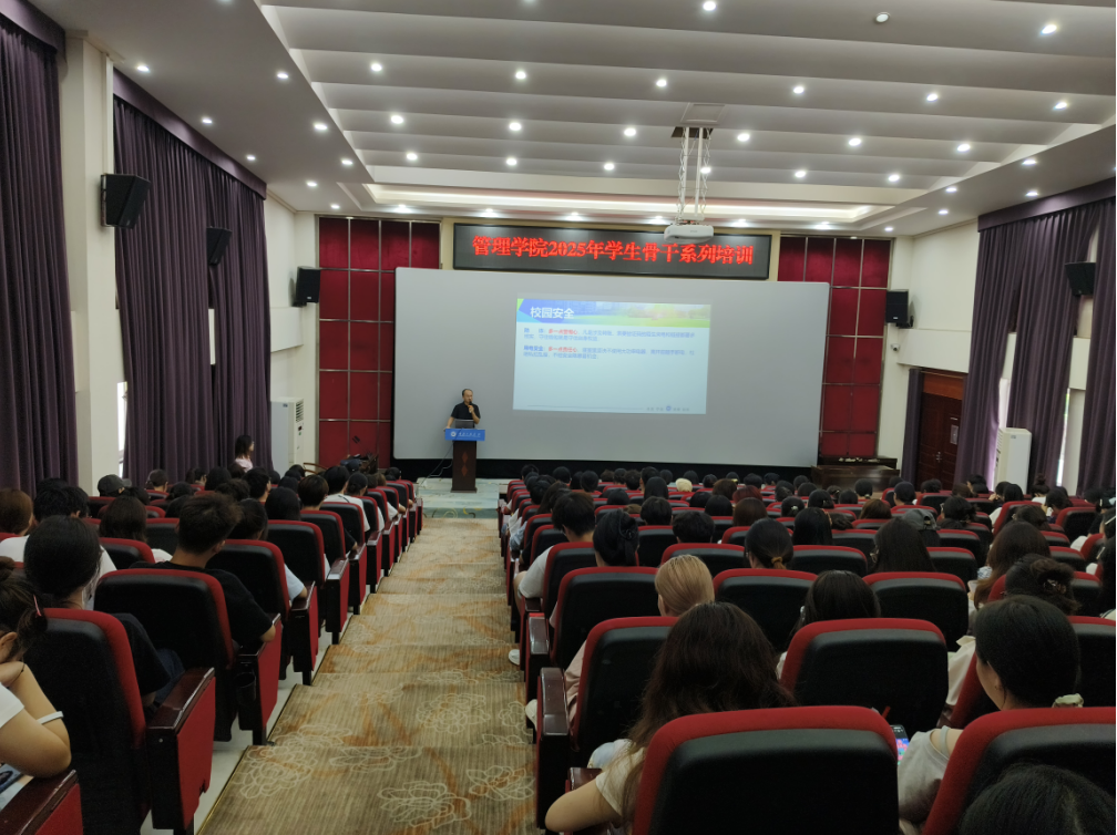 管理学院2025年学生骨干系列培训在办公楼报告厅举行,学院党总支书记尚伟、学生科长王燕楠,以及管理学院全体班长团支书及寝室长参加了会议。此次大会围绕班级考核、安全管理、行为规范及新生班级建设等核心内容,为学生骨干开展系统指导。