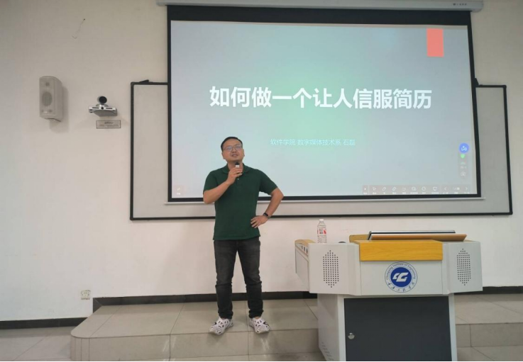讲座,石磊老师着重强调了三个关键要点:一是要有拿得出手的作品,在数字媒体技术领域,作品是展现个人能力与专业素养的重要凭证,学生要在简历中精心挑选并展示与求职岗位相关的优质作品,详细描述其设计思路、技术实现、创新点及实际效果;二是简历制作要点,专业素养是求职核心竞争力,制作时要紧密围绕求职岗位要求,精准提炼并突出相关技能,用具体数据和成果支撑技能描述;三是要能“包装”自己,即通过合理表达和呈现方式充分展现自身优势亮点,分享了采用简洁语言、突出关键词、运用清晰段落结构等技巧,并强调简历排版设计美观整洁易读的重要性。
