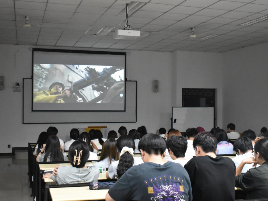 活动伊始,主持人谭文同志向大家介绍了影片《捍卫者》。这部影片聚焦抗战历史,以淞沪会战中姚子青率领六百壮士守卫上海宝山县的真实事件为蓝本,生动讲述了先辈们为守护家国,在战场上奋勇杀敌、浴血奋战的故事,主题紧紧围绕爱国情怀与革命先辈的使命担当展开。在观影过程中,同学们全神贯注。影片中,先辈们面对日军重炮、坦克的猛烈进攻,毫不退缩,运用智慧与勇气一次次挫败敌人攻势;战斗后期,即便弹尽粮绝,他们也坚守阵地,展开残酷巷战,直至战至最后一人。先辈们为家国奋勇抗争的热血与无畏,让在场同学深刻感受到革命先辈的抗战精神,不少同学的眼眶湿润了。
